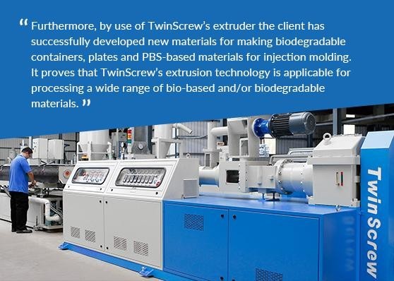 Since 2016 TwinScrew’s extruding system has been applied to blend starch and PBAT and the composite granules has been used for making film products and gain the DIN CERTCO’s compostable certification in 2019. In addition, TwinScrew’s team has also collaborated with the client developing materials for making plates, tubes and the products made by injection molding technology. Along with our client’s success, we have also accumulated professional expertise in the mechanical requirements specific for bio-based and/or biodegradable materials. We have also in depth developed the knowledge for optimizing the process parameters in the production lines. It is valuable for process development and trouble shooting at the first time.